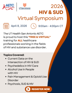 ![]() | 6th Annual HIV & SUD Virtual Symposium April 8, 2026 Time: 9:00am to 4:00pm CT Our 6th Annual HIV & SUD Virtual Symposium returns on April 8, 2026. Planning and coordination is well underway and we are excited to bring you all a wonderful line up of diverse experts in the fields of HIV and SUD. Join us for a full day of presentations that take us deep into the intersection of HIV, SUD and beyond! Register for this Training |