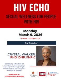 ![]() | HIV ECHO March 9, 2026 Dr. Crystal Walker is a leader in HIV treatment, prevention, and sexual health, guiding care at the David Powell HIV Clinic and serves as the Associate Director of the sexual health program at an FQHC, providing expertise across the organization. She helped launch the IdealHealth Sexual Health Clinic, initiating injectable PrEP for 100+ patients in its first year. With 10+ years of clinical, research, and educational experience, she combines HIV care, PrEP, lower genital tract disease expertise, and interdisciplinary education. Time: 11:00am to 12:00pm CT Register for this Training |