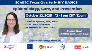 ![]() | SCAETC Texas Quarterly HIV Basics October 22, 2025 Join us on October 22 as Dr. Spears presents on Epidemiology, Care, and Prevention in HIV! Time: 12:00pm to 1:00pm CT Register for this Training |