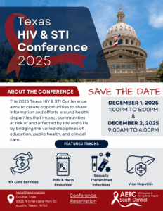 ![]() | 2025 Texas HIV & STI Conference December 1 & 2, 2025 Mark your calendars for the return of the Texas HIV & STI Conference in Austin, Texas! Planning is well underway and we are excited to bring you all a great group of presenters and leaders in the HIV and STI fields. Book your hotel and reserve your spot in the conference TODAY! *Registration is now OPEN!* Book your Hotel Here Register for the Conference |