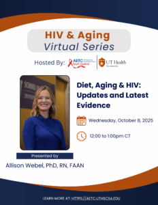 ![]() | Lunch and Learn Session with a focus on Aging with HIV October 8, 2025 Allison Webel, PhD, RN, FAAN clinical research laboratory is dedicated to generating high-quality evidence to help individuals with HIV live and age well, with a particular focus on diet and exercise interventions. She has extensively published in this field, with over 180 peer-reviewed manuscripts addressing HIV and aging, behavioral science, and global health. Her research has been supported by institutions including the National Institute for Nursing Research, the National Heart, Lung, and Blood Institute, the American Heart Association, Andy Hill Foundation, Gilead Sciences, and the National Institute on Aging. Her research lab is currently coordinating the PROSPER-HIV study, the largest longitudinal study to date examining the impact of physical activity and diet on the symptom experience of adults living with HIV. Additionally, Dr. Webel co-leads the EXTRA-CVD study, a multisite implementation science study testing a nurse-led intervention to reduce blood pressure and cholesterol in adults with HIV, and the HEALTH study, a multisite clinical trial evaluating the effects of high-intensity interval training on fatigue and physical function in older adults with HIV. Time: 12:00pm to 1:00pm CT Register for this Training |